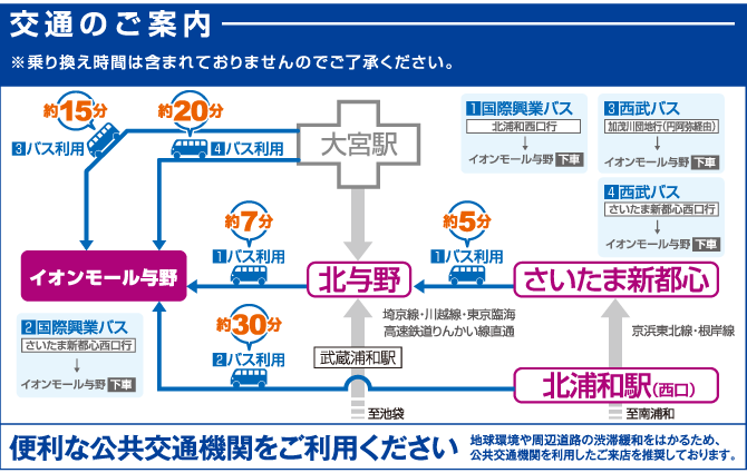 ※同じ乗口から出るバスでも、(藤橋)加茂川団地行はイオンモール与野を経由しませんので、乗車前に経由地のご確認をお願いいたします。